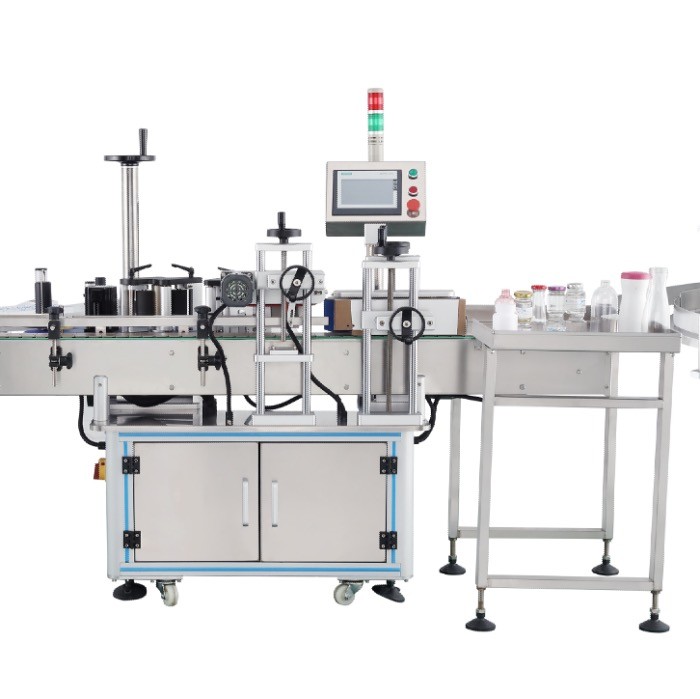 Машина для прикрепления этикеток круглой бутылки полностью автоматического само-прилипателя вертикальная, широко используемая в различных спецификациях окружной поверхности обозначая, бутылка круга конусности обозначая, также добавила бы 2 бортовое или поверхностную обозначая голову, для пользы 2 сторон обозначая,